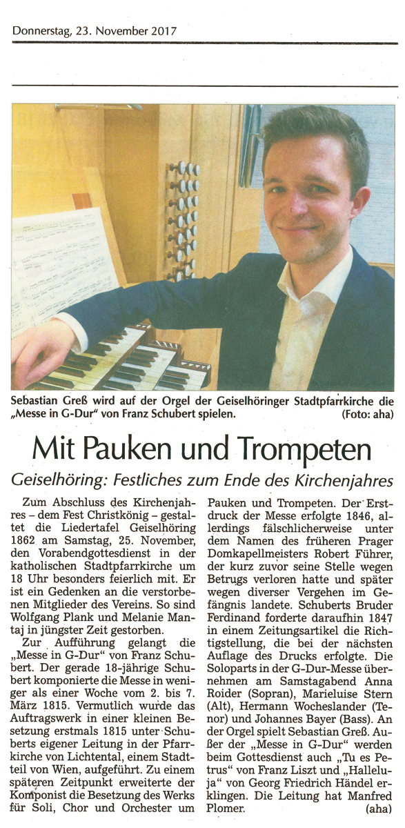 Zum Abschluss des Kirchenjahres – dem Fest Christkönig – gestaltete die Liedertafel Geiselhöring 1862 am Samstag, 25. November, den Vorabendgottesdienst in der katholischen Stadtpfarrkirche um 18 Uhr besonders feierlich mit. Er war ein Gedenken an die verstorbenen Mitglieder des Vereins. So sind Wolfgang Plank und Melanie Mantaj in jüngster Zeit gestorben. Zur Aufführung gelangte die „Messe in G-Dur“ von Franz Schubert. Der gerade 18-jährige Schubert komponierte die Messe in weniger als einer Woche vom 2. bis 7. März 1815. Vermutlich wurde das Auftragswerk in einer kleinen Besetzung erstmals 1815 unter Schuberts eigener Leitung in der Pfarrkirche von Lichtental, einem Stadtteil von Wien, aufgeführt. Zu einem späteren Zeitpunkt erweiterte der Komponist die Besetzung des Werks für Soli, Chor und Orchester um Pauken und Trompeten.