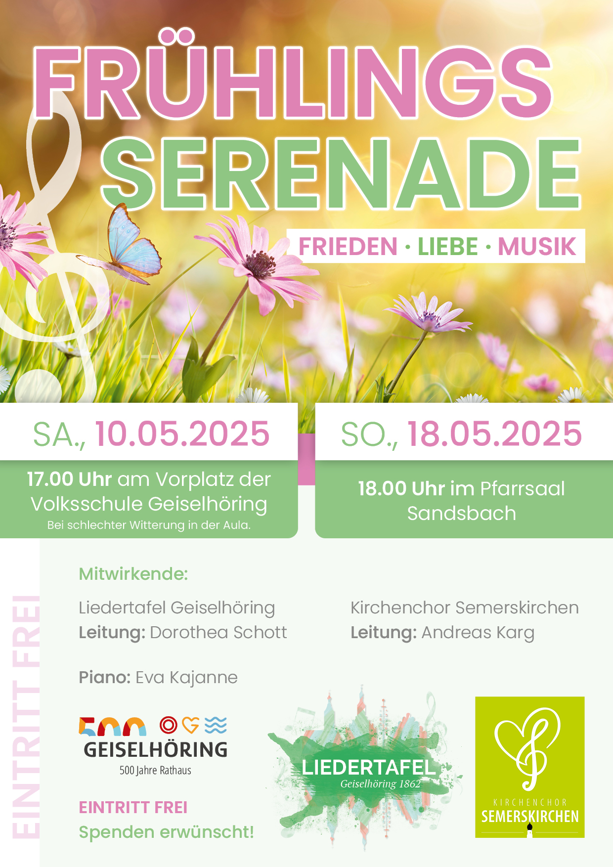 Bei einem Frühlingskonzert unter dem Titel „Friede-Liebe-Musik“ begeisterten in einem Gemeinschaftskonzert der Semerskirchener Kirchenchor unter der Leitung von Andreas Karg und die befreundete Liedertafel Geiselhöring mit ihrer Leiterin Dorothea Schott am Sonntagabend die Zuhörer im vollbesetzten Sandsbacher Pfarrsaal. Mit tiefgründigen Informationen, Charme und Witz hatten Chorleiter Andreas Karg und der Vorstand der Liedertafel Geiselhöring, Hermann Wocheslander, die Veranstaltung moderiert.