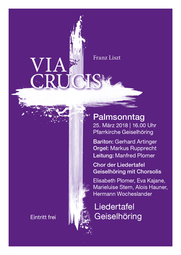 Am Palmsonntag, dem Beginn der Karwoche, brachte die Liedertafel Geiselhöring unter der sicheren Leitung von Manfred Plomer in der katholischen Stadtpfarrkirche „Via crucis“ von Franz Liszt zur Aufführung. Das Werk für Orgel, Solostimmen und Chor ist eine musikalische Kreuzwegdarstellung und als solche ein Unikum in der Musikliteratur. Liszt begann die Komposition seines Spätwerkes im Herbst 1878, als er in Rom wohnte und es im Februar 1879 in Budapest vollendete. Zur Komposition „Via crucis“ – Franz Liszt war immer ein sehr gläubiger, für Mystik empfänglicher Katholik – wurde er durch das Beten des Kreuzweges am Karfreitag im römischen Kolosseum angeregt.